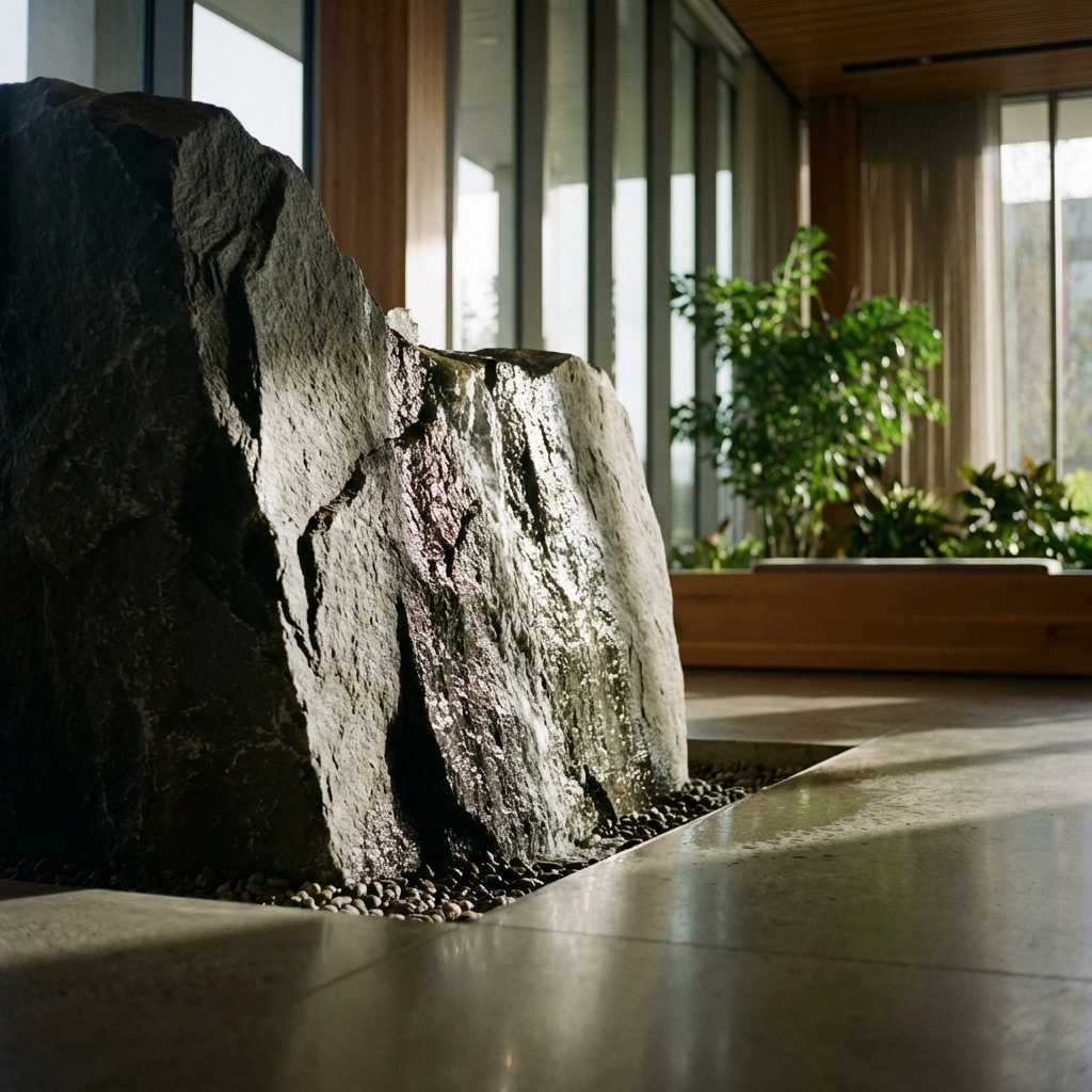Traditional indoor water features often work against those goals. Potable water use, evaporation loss, chemical treatment, and added maintenance all complicate compliance.